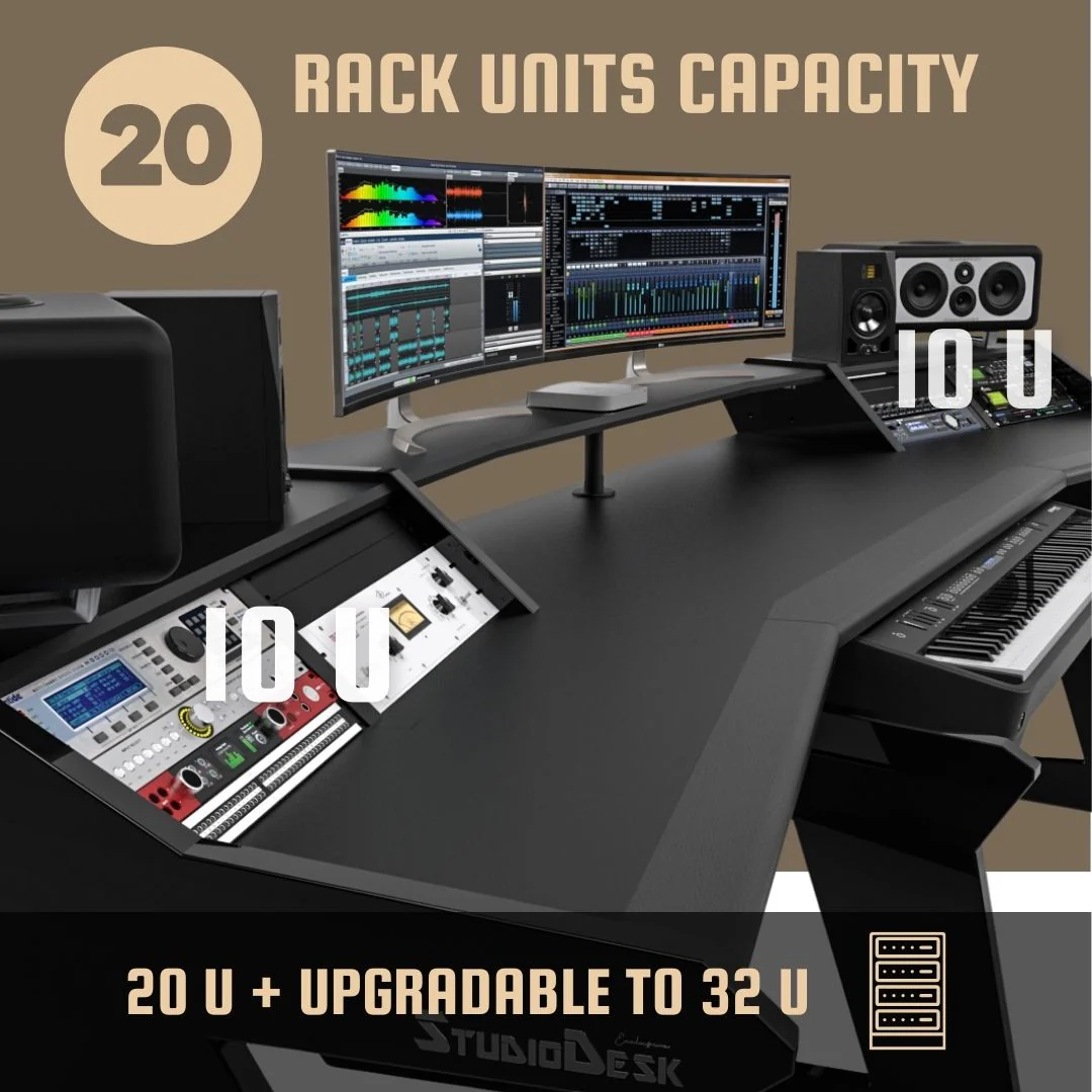 Adding the Keyboard Stand to this setup will give you the ability to have up to 88 keys keyboard in front of the producer or move it aside if there are other musicians who need to play. The keyboard stand is on casters. Push it under the desk when not in use or pull it out when you need it. In this bundle, you are receiving extenders for the desk of 35 mm (check gallery).